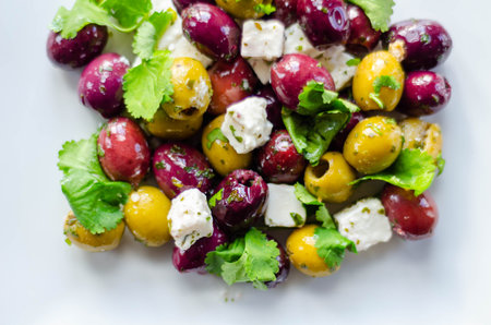 Fresh Greek salad based on green and black olives with pieces of white feta cheese and parsley, traditional Mediterranean cuisine