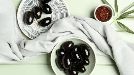 Banner with olives on a white plate. Still life with a towel on a gray table, space for text