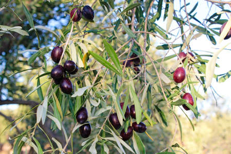 Ripe black olives on olive tree branch ready to harvest.