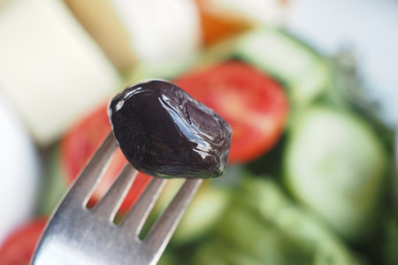 This is a CloseUp Image of a Black Olive Resting on a Fork with a Salad in the Background