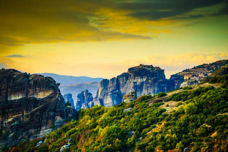 Greece. Summer sunset in Meteora. Rock monastery on the background of mountain peaks and valley
