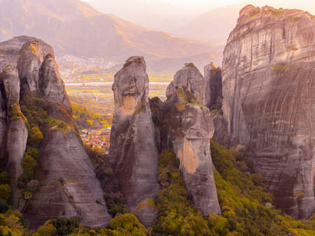 Beautiful aerial panorama of Meteora rock pillars and monasteries