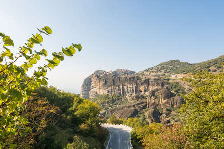 Road running under monasteries build on sandstone ridge, Meteora, Greece.