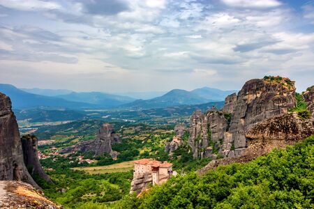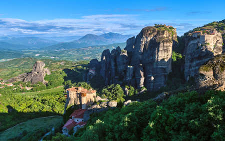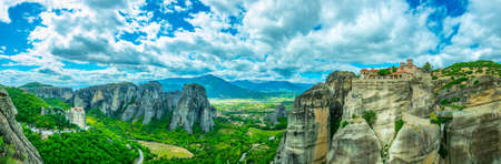 Monastery Meteora Greece. Stunning summer panoramic landscape. View at mountains and green forest against epic blue sky with clouds.