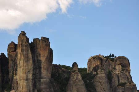 Stiff natural big rock formation Sandstones of Meteora nearby the city of Kalambaka. Beautiful summer weather. Leisure time traveling. High quality photo