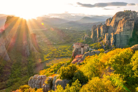 Greece. Sunset over a Greek rock monastery in Meteora (near Kalambaka) and sunbeams