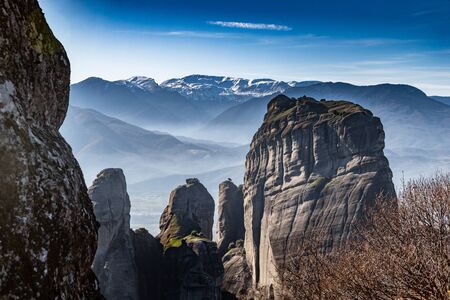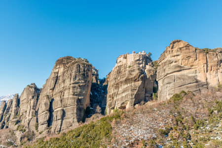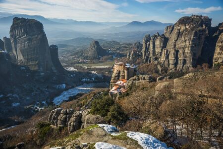Scenic views of the mountains and monasteries of Meteora in winter, Greece