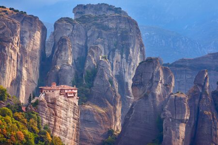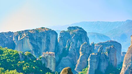 Scenic view on natural rock formations. Meteora Monasteries on sunrise, Greece. Orthodox religious toursm sight.