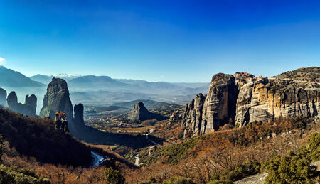 Scenic views of the mountains and monasteries of Meteora, Greece