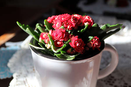 Kalanchoe Blossfeldiana (Flaming Katy, Christmas Kalanchoe, Florist Kalanchoe) on the window. Close-up, selective focus
