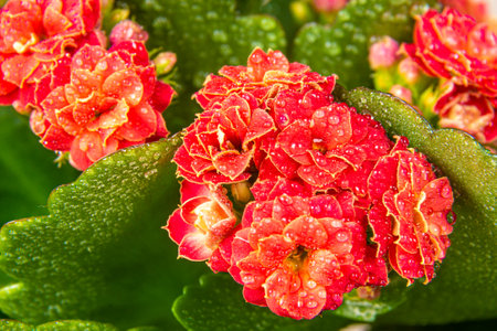 bright red flower with green leaves Kalanchoe Blossfeld with dew drops, selective focus on nearby inflorescences