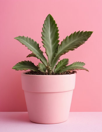 Pink kalanchoe flower in a pot on pink