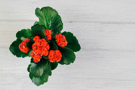 Closeup of kalanchoe plant with red flowers in a pot on light background with copy space