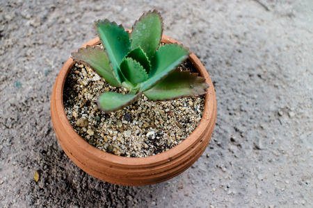 kalanchoe in orange flower pot on green background