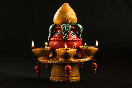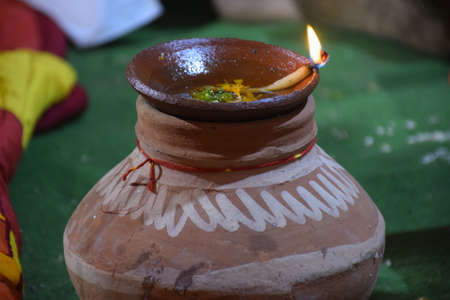 holy offerings of burning clay oil lamp for hindu god at festival from unique perspective