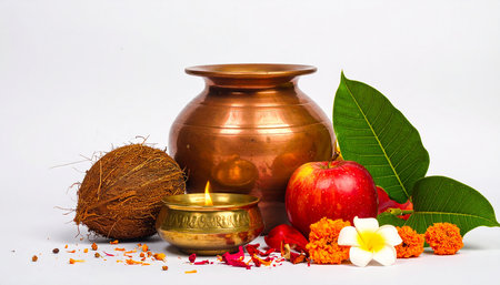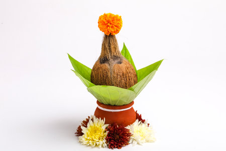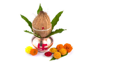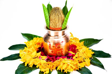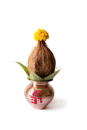 Copper Kalash with coconut, mango leaf, Haldi, kumkum and sweets with marigold flower decoration on a white background. Essential in Hindu puja.