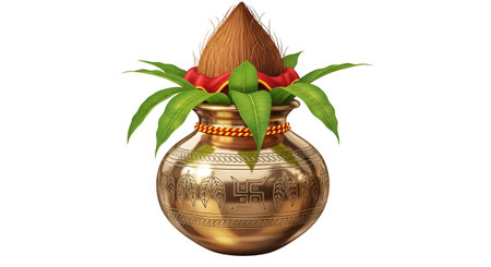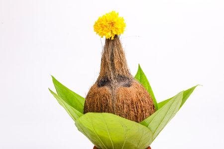 Copper kalash with coconut, mango leaf, and marigold flower isolated on white background