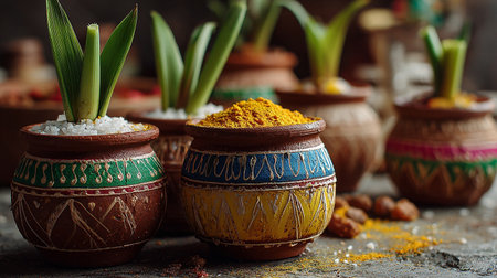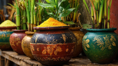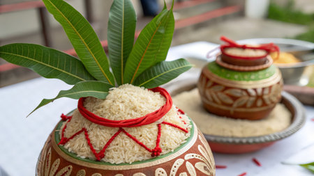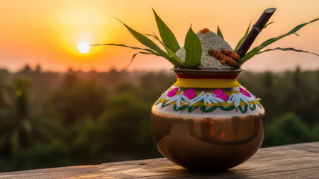 Sugarcane, rice pot, flowers, steaming rice, rural Indian festival