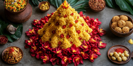 Delicious Yellow Rice Pyramid Decorated with Red Flowers Festive Food Photography art dish meal