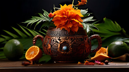 A traditional clay pot adorned with vibrant flowers and surrounded by mangoes, perfect for celebrating cultural festivals. The serene background creates a festive atmosphere.