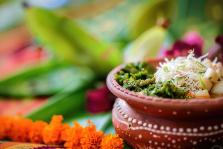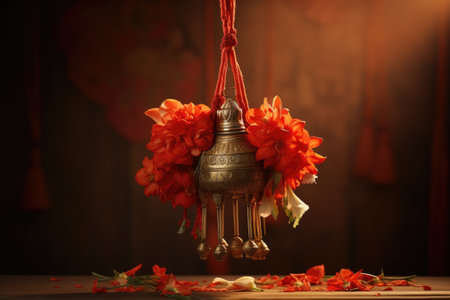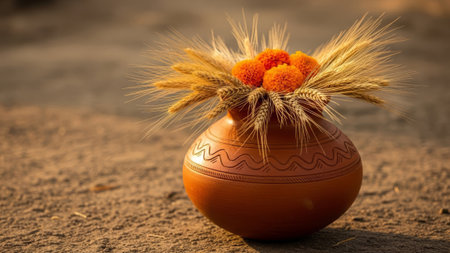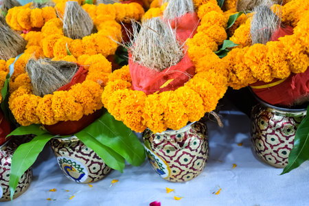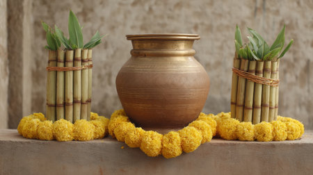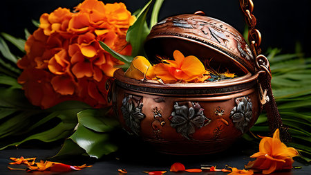 A beautiful traditional Indian pot adorned with fresh flowers and vibrant leaves, symbolizing celebration and spirituality during a festive occasion.