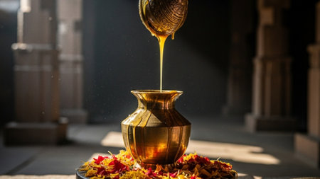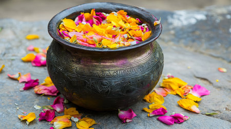 Traditional Pot Filled with Vibrant Petals Celebrating Maha Shivaratri in India. Concept of Cultural Festivals, Spiritual Traditions, Colorful Offerings.