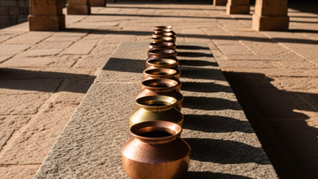 A cinematic environmental wide shot of a horizontal line of traditional Indian Lota (small water pot