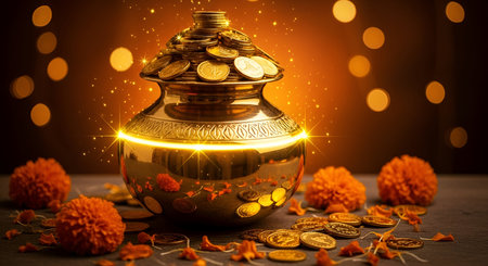 A richly decorated golden pot, resembling a Kalash, is the central focus, overflowing with gold coins. The pot sits on a surface adorned with scattered gold coins and vibrant orange marigold flowers. The background is softly blurred with warm, golden bokeh lights, creating a magical and auspicious atmosphere. Sparkles and light effects enhance the sense of wealth and celebration.