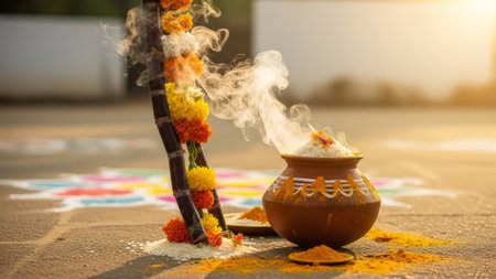Traditional Indian harvest festival celebration with steaming pot and sugarcane.
