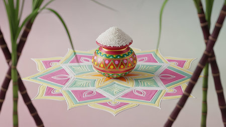 Festive rice pot on rangoli with sugarcane stalks.