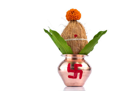 Copper Kalash with coconut and mango leaf with floral decoration on a white background. Essential in Hindu Puja.
