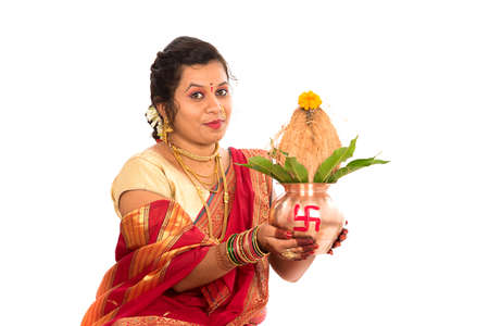 Indian Traditional Woman performing worship with copper kalash, Indian Festival, copper kalash with coconut and mango leaf with floral decoration, essential in hindu puja.