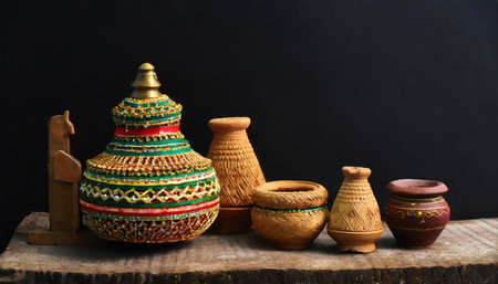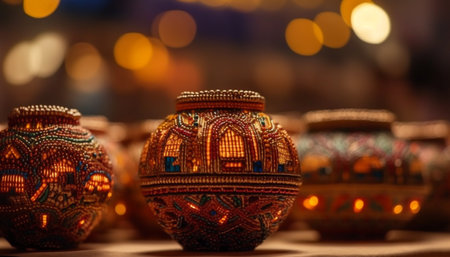 Multi colored pottery jars illuminate traditional Turkish celebration indoors generated by artificial intelligence