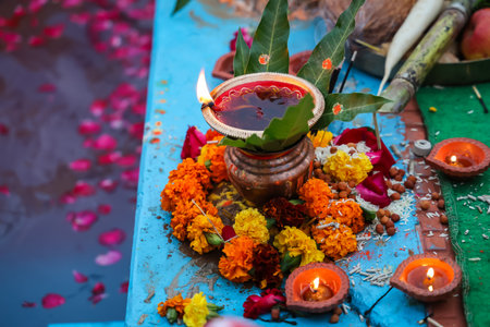 holy offerings of fruits flowers lamps and cloths in river to sun god on the occasion of chhath puja or chatt puja.