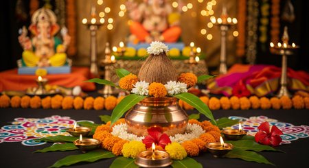 A traditional Indian religious offering featuring a Ganesha idol, a kalash with coconut and mango leaves, surrounded by marigold flowers and lit diyas.