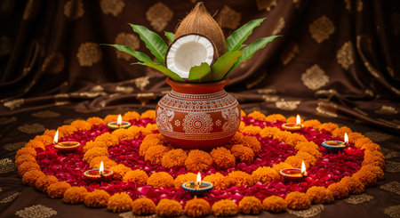 A beautifully decorated Kalash, a traditional Indian pot, is adorned with a coconut and fresh mango leaves. It is surrounded by a circular arrangement of vibrant marigold flowers and delicate rose petals. Small oil lamps, known as diyas, are lit and placed around the floral arrangement, casting a warm and festive glow. The scene is set against a rich, patterned brown silk fabric, evoking a sense of tradition and celebration.