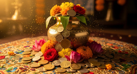 A traditional brass Kalash adorned with vibrant marigold flowers and overflowing with golden coins, signifying wealth and good fortune.