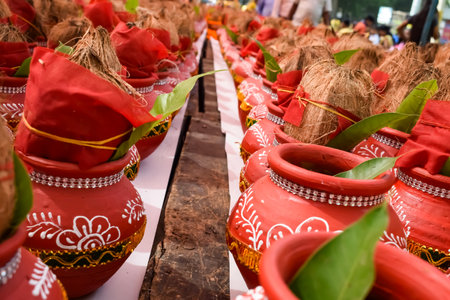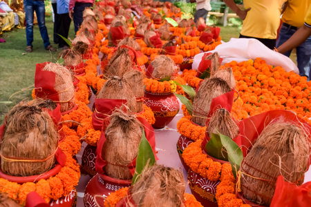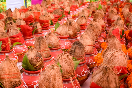 Kalash with coconut and mango leaf with floral decoration earthen pots containing sacred water. Kalash for hindu puja during Jagannath Temple Mangal Kalash Yatra, front view, closeup