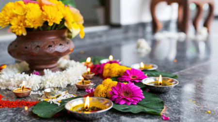 A beautifully arranged festive setting featuring colorful flowers and oil lamps on a polished floor, perfect for celebrating traditional Indian holidays and rituals.