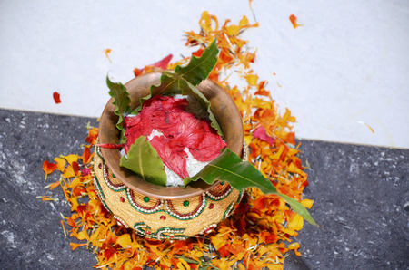 A copper puja kalash with coconut and mango leaf with floral decoration essential in Hindu