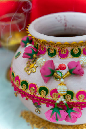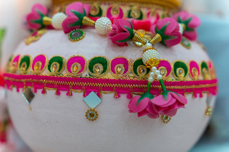 Clay pot decorated with flowers and gems for Indian wedding