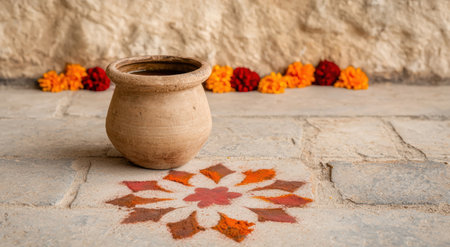 A traditional earthen pot emits steam, surrounded by vibrant flowers in a serene outdoor setting, capturing the essence of culture, peace, and nature's beauty.