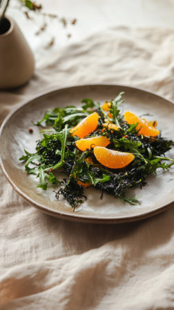 Vibrant salad featuring fresh arugula, juicy orange slices, and seaweed, artfully arranged on a ceramic plate. The composition highlights a healthy and refreshing culinary choice