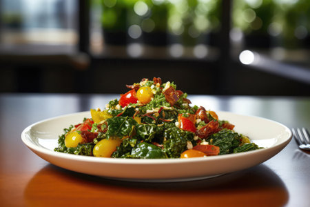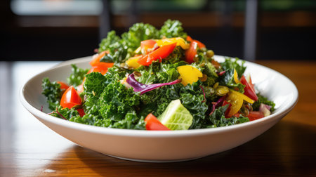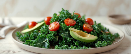 AI Generated. Fresh kale salad with cherry tomatoes and avocado served on a light table setting
