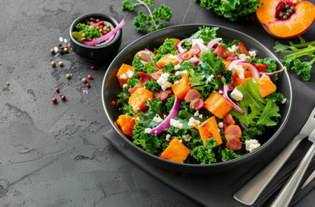 A vibrant salad featuring fresh kale, roasted butternut squash, crispy bacon, and pine nuts is served in a bowl. Surrounding ingredients like potatoes and peppers add to the freshness of the setting.