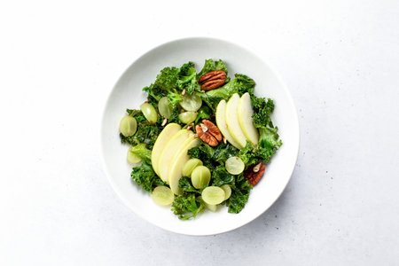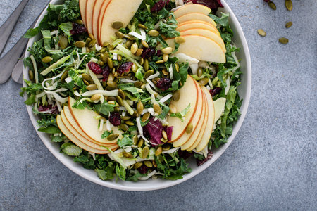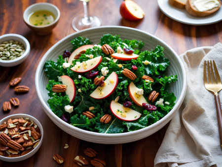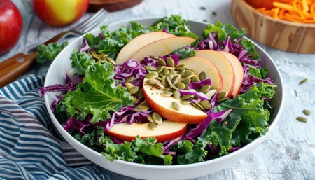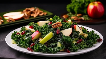 A delicious kale salad adorned with thin apple slices and crunchy walnuts, showcasing a vibrant, healthy dish ideal for rejuvenating meals and culinary presentations.