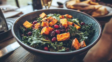A vibrant salad featuring roasted sweet potatoes, fresh kale, and mixed berries, perfect for a healthy meal or a colorful side dish at gatherings.
