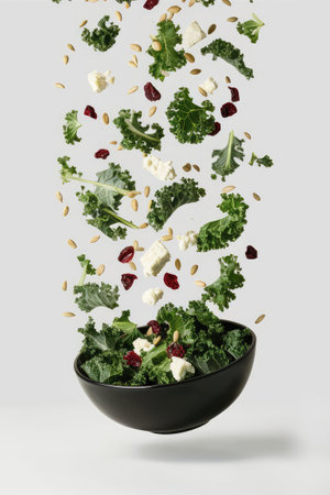 bowl of kale salad with flying seeds isolated on white, food levitation