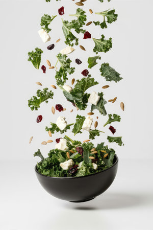 Fresh kale salad with feta cheese falling into black bowl on white background