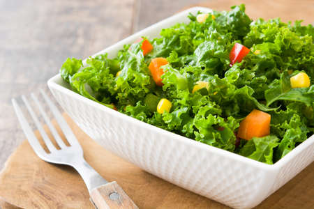 Kale salad in bowl with carrot, pepper and sweet corn on wooden background